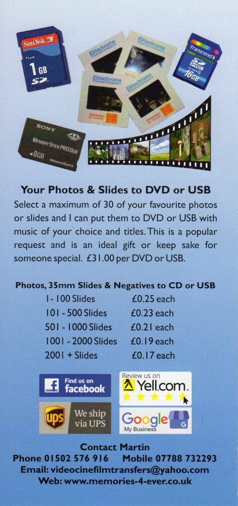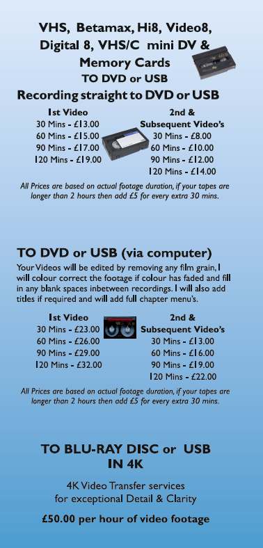 I am proud to offer you my Video and Cine Film transfer service and the quality it delivers, you are assured of my prompt and personal attention